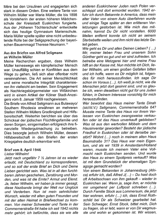 Sein mir vorliegende Briefwechsel mit einem jüdischen Flüchtling aus Euskirchen beweist, dass im Dritten Reich auch christlich-jüdische Freundschaften bestehen bleiben konnten und den rassistischen Nationalsozialismus überstanden. Ein Stapel diesbezüglicher Briefe und Dokumente aus der Zeit 1946 -1973 gibt Aufschluss über menschliche Beziehungen und damit verbundene Reaktionen in der Nachkriegszeit. Gleichzeitig spürt man die Dankbarkeit von Alfred Seligmann (1897-1975), der als rassisch Verfolgter die Voreifel verließ und in Südafrika überlebte.