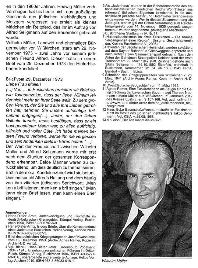 Ein Beispiel befasst sich mit Wilhelm Müller aus Euskirchen (Wißkirchen), dessen Freundschaft mit dem jüdischen Viehhändler Alfred Seligmann auch durch den rassistischen Nationalsozialismus nicht beeinträchtigt werden konnte. Im vor wenigen Tagen erschienen Jahrbuch des Kreises Euskirchen 2016 stelle ich diese christlich-jüdische Freundschaft - unter der Überschrift „Hinweis auf einen `stillen Helfer´ im Dritten Reich“ - auf den Seiten 58 bis 67 dar. In absehbarer Zeit wird der vollständige Artikel auf meiner regionalhistorischen Homepage zu lesen sein. Dort sind auch Hinweise auf meine früheren Jahrbuch-Publikationen und Bücher zu finden.