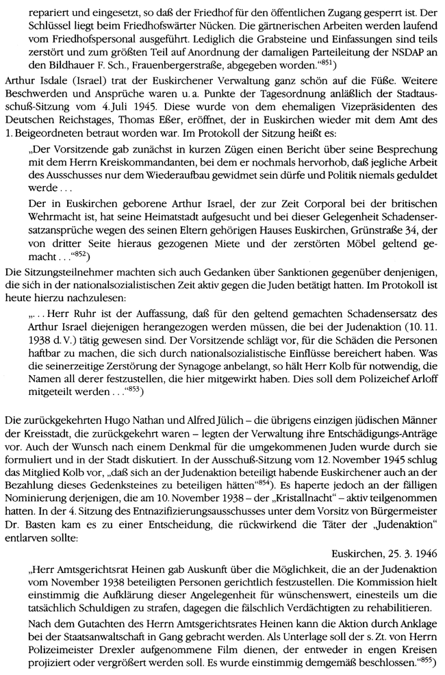 ...... Mit den Besatzungstruppen kamen auch einige Juden zurück, die im Euskirchener Kreisgebiet geboren waren. Da waren zum Beispiel Arthur Levano (1890-1960) aus Kommern, Arthur Rothschild aus Euskirchen und der aus Großbüllesheim stammende Helmut Meyer, dessen Vater Bernhard Meyer seinerzeit eine Metzgerei am Bahnhof hatte. Die Zurückkehrenden trafen beim Wiedersehen mit ehemaligen Freunden und Nachbarn eine sehr genaue Auswahl. Dennoch war ihnen alles fremd geworden. Das Aussehen der ehemaligen Heimat hatte sich geändert; viele Bekannte waren zudem im Kriege umgekommen.
